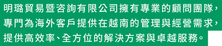 明璐貿易與顧問有限公司擁有專業的顧 問團隊,專門為海外客戶提供在越南的管理和經營需求,提供高效率、全方位的解決方案和卓越的服務。
